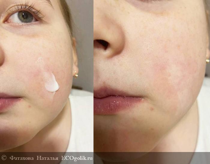 Применение обычное: нанести небольшое количество крема массажными движениями на очищенную кожу. Здесь откомментирую. Если вы вдруг переборщили с количеством, не нужно паниковать и пытаться убрать излишки крема, она через пару минут "скушает" абсолютно весь крем. Мы любим в баню с подругами ходить, я всегда беру его туда, чтобы лицо после бани увлажнить. У подруг иной тип кожи, более жирный. Крем протестирован на разных типах кожи - даже кожа жирнее идеально его впитывает и дает эффект матовости. Консистенция у крема эластичная, легкая, быстро впитывается, нет ощущения жирности на лице. Зато эффект увлажнения мгновенный и чувство стянутости также мгновенно пропадает.