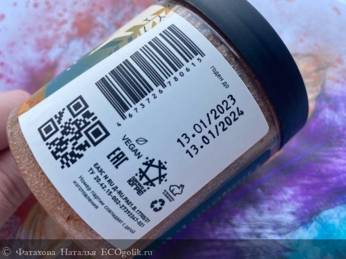 Упакован скраб в баночку с откручивающейся крышкой, под которой есть защитная фольгированная мембрана. Объем 250 мл. Дата изготовления указана в виде штампа на этикетке. Подойдет для веганов. Перед первым открытие вы увидите фольгированную защитную мембрану. Срок хранения скраба 12 месяцев.