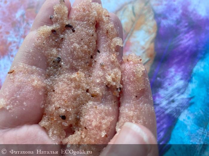В составе благоприятно сочетаются сахар, соль и кокосовое масло. Меня очень порадовало, когда я наносила скраб, что скрабирующие частички разнообразные, их много: брусника ягода и лист,корень шиповника, сахар и соль. Мне больше нравятся сахарные скрабы, а не соляные, потому что от соляных у меня слегка щиплет кожу. Здесь негативного впечатления не было никакого, кожа очень хорошо восприняла состав скраба.