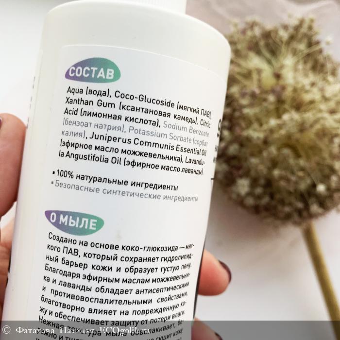 Компоненты простые и понятные. В основе мыла ,конечно же, водная основа с мягким ПАВ (кокоглюкозид), который отвечает за пенообразование средства. Есть отшелушивающий компонент - лимонная кислота. Загустители, консерванты - только безопасные. Ароматическая композиция - натуральные эфирные масла можжевельника и лаванды.
