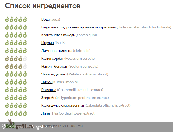 aqua, Сoco-glucoside, Hydrogenated starch hydrolysate, Xantan gum, Inulin, Cymbopogon schoenanthuscitric oil,citric acid, Potassium sorbate, Sodium benzoate, Melaleuca Alternifolia oil, Сitrus limon oil, Chamomilla recutita extract, Hypericum perforatum extract, Calendula officinalis extract, Tilia Cordata flower extract