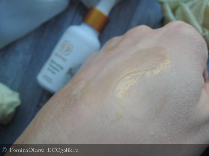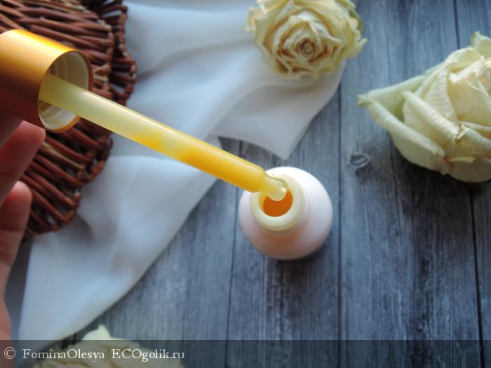 Когда я впервые открыла флакон, то была очень удивлена цветом сыворотки. Привыкла, что обычно они прозрачные или молочного цвета. А тут такое солнышко внутри