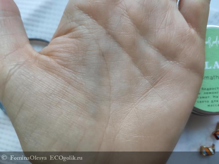 От тепла воски и масла подтаивают, как и принято у свечей. Через 5-10 минут образуется уже достаточное количество жидкого масла, которое и станет основой для массажа. Производитель предлагает вылить на ладонь небольшое количество средства - его температура не опасна для кожи