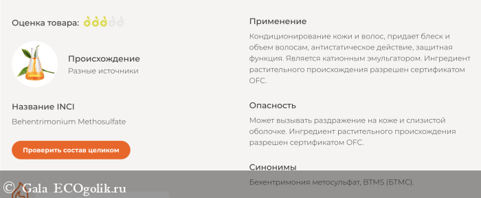 В составе все на 5, есть лишь один "троечник". Но он натурального происхождения и разрешен в натуральной косметике. Может вызвать раздражение, но у меня с этой задачей он не справился
