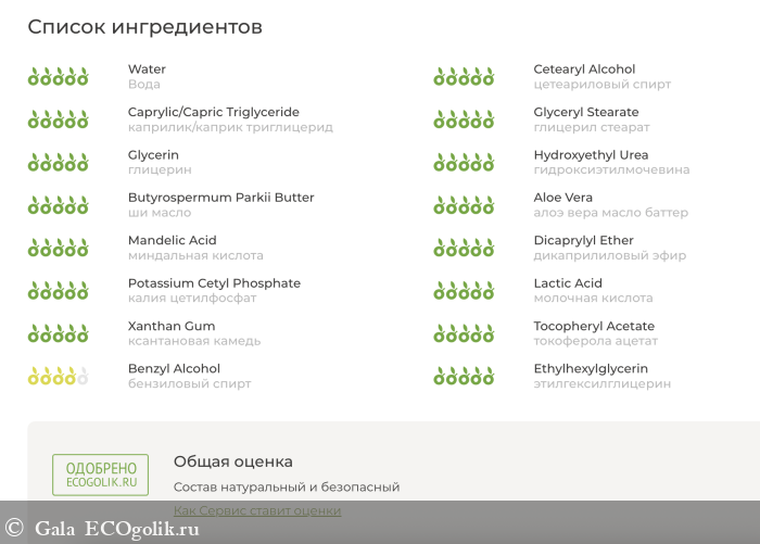 Как видим - с составом все прям отлично, только один ингредиент на 4, а остальные на 5 - это