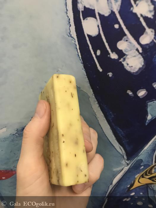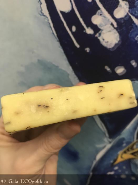 Мыло упаковано в прозрачную пленку. Наверное, упаковка в коробочку/бумажную стружку выглядела бы презентабельнее и лучше бы сохранила уголки брусочка, но мне не на подарок, так что ок.