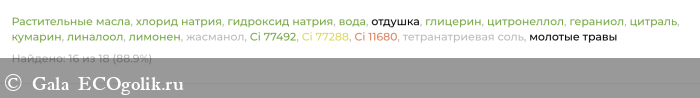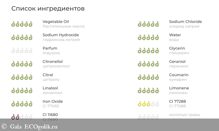 Несмотря на указания производителя, что пигменты натуральные, Экоголик (и интернет) с этим не совсем согласны. И если один пигмент имеет 5 баллов, то еще один уже 3, а последний вообще 2 балла. Кстати, интересно, что пигменты указаны одинаковые, а цвет мыла принципиально отличается.