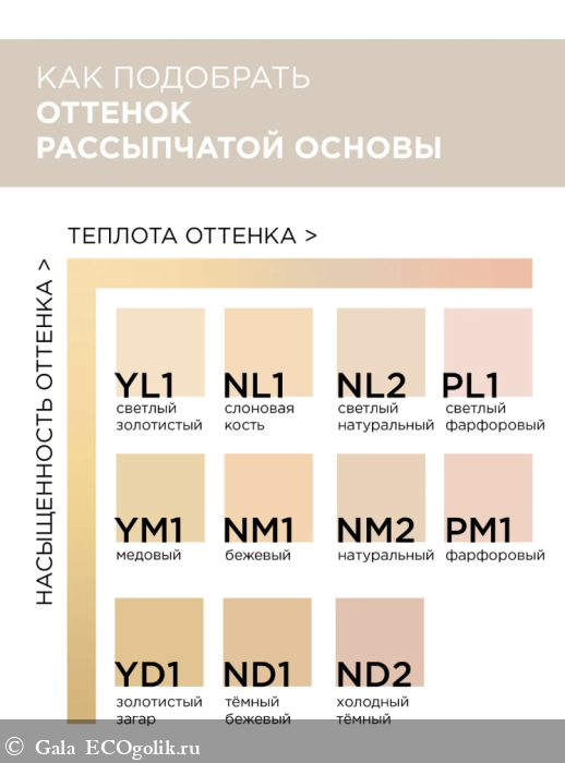 ), но мне предложили все-таки (NL2, светлый натуральный) на тон светлее того, что мне показалось подходящим изначально (NM2, натуральный). Выбрала цвет по своему убеждению и не прогадала! На зиму мне зайдет отлично. Летом (я много времени провожу на улице) понадобится тон потемнее. Возможно не "ND2, холодный темный", который в таблице под "натуральным", а даже "ND1, темный бежевый", все-таки загар даст еще более коричневый тон. Ну или если не определюсь, то у них есть пробники! Кстати, на сайте указано, что у данной основы есть SPF10. Для работы целый день летом в огороде этого конечно не хватит, скорее столько надо иметь для выхода на улицу в межсезонье (зимой в Подмосковье УФ-индекс обычно на нуле, можно и вообще без солнцезащиты обойтись, иначе как получать витамин Д?). А сейчас оттенок прям мой. У меня красноватое лицо, но при этом желтоватый тон кожи. Причем раньше у меня он был скорее белый (подружки говорили, что я как сметана), а с возрастом обнаружила, что определенно есть желтоватый подтон, особенно по сравнению с детьми и мужем. Там даже если есть загар, то все равно видно, что он на белой коже. А я теперь по жизни "с легким загаром".