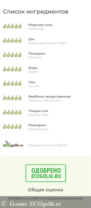 экологически чистая морская соль, масло ши, глицерин, вода, льняное масло, льняное семя, эфирное масло вербены, соевое масло, экстракт розмарина