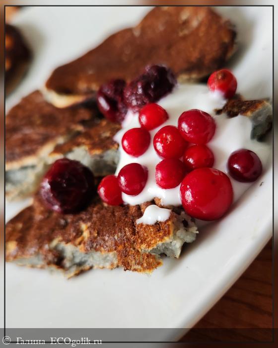 В моей морозилке есть любая ягода и смородина всегда была, а тут не оказалось) но и с брусникой и вишней очень вкусно плюс сметанка)