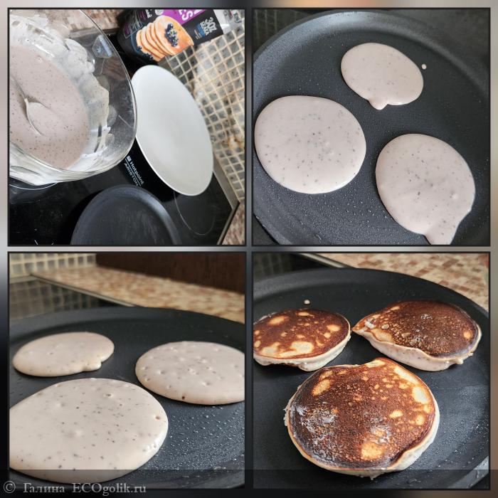 Для приготовления одной порции (2-3 блинчика) смешайте в емкости 50 г смеси с водой или молоком в соотношении 1:1 (4-5 столовых ложек смеси и 5-6 столовых ложек жидкости). Тщательно перемешайте полученную смесь до получения однородной консистенции. Выпекайте блинчики с обеих сторон на разогретой сковороде до готовности (по желанию на сковороду можно добавить небольшое количество растительного масла)