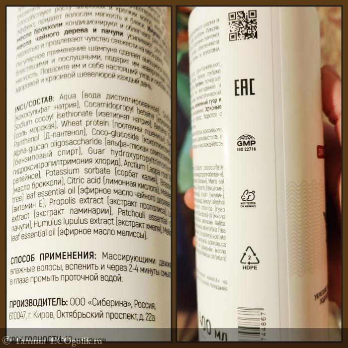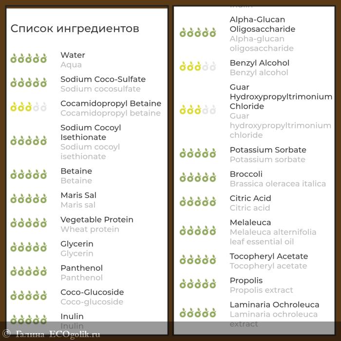Aqua (вода дистиллированная), Sodium cocosulfate* (кокосульфат натрия), Cocamidopropyl betaine (кокамидопропилбетаин), Sodium cocoyl isethionate (изетионат натрия), Betaine (бетаин), Maris sal (соль морская), Wheat protein (протеины пшеницы), Glycerin (глицерин), Panthenol (Д-пантенол), Coco-glucoside (кокоглюкозид), Inulin (инулин), Alpha-glucan oligosaccharide (альфа-глюкан олигосахарид), Benzyl аlcohol (бензиловый спирт), Guar hydroxypropyltrimonium chloride (гуар гидроксипропилтримония хлорид), Arctium Lappa root (Burdock) оil (масло репейное), Potassium sorbate (сорбат калия), Brassica oleracea italica (масло брокколи), Citric acid (лимонная кислота), Melaleuca alternifolia (tea tree) leaf essential oil (эфирное масло чайного дерева), Tocopheryl acetate (витамин Е), Propolis extract (экстракт прополиса), Laminaria ochroleuca extract (экстракт ламинарии), Patchouli essential oil (эфирное масло пачули), Humulus lupulus extract (экстракт хмеля), Melissa (Melissa citratum) leaf essential oil (эфирное масло мелиссы).