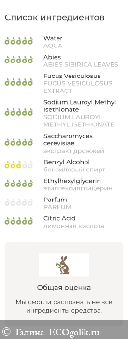 AQUA with infusion of JUNIPERUS COMMUNIS FRUIT (отвар можжевельника), ABIES SIBIRICA LEAVES (отвар пихты), FUCUS VESICULOSUS EXTRACT (экстракт фукуса),SODIUM LAUROYL METHYL ISETHIONATE (пав из кокосовых орехов), COCO GLYCOSIDE (эмульгатор из кокоса), COCAMIDOPROPIL BETAIN (мягкий пав из кокосового масла, СODIUM COCOYL APPLE AMINO ACID (пав из аминокислот яблока), HYDROLIZED WHEAT PROTEINS (AND) RYE PROTEINS (AND) OATS PROTEINS (гидролизат ржи, овса, пшеницы), SACCHAROMYCES CEREVISIAE EXTRACT (экстракт дрожжей),BENZYL ALCOHOL AND ETHYLHEXYLGLYCERIN (бензиловый спирт и этилгексилглицерин), POLYQATERNIUM-10 (поликватерниум - 10), PARFUM (отдушка), CITRIC AСID (лимонная кислота)
