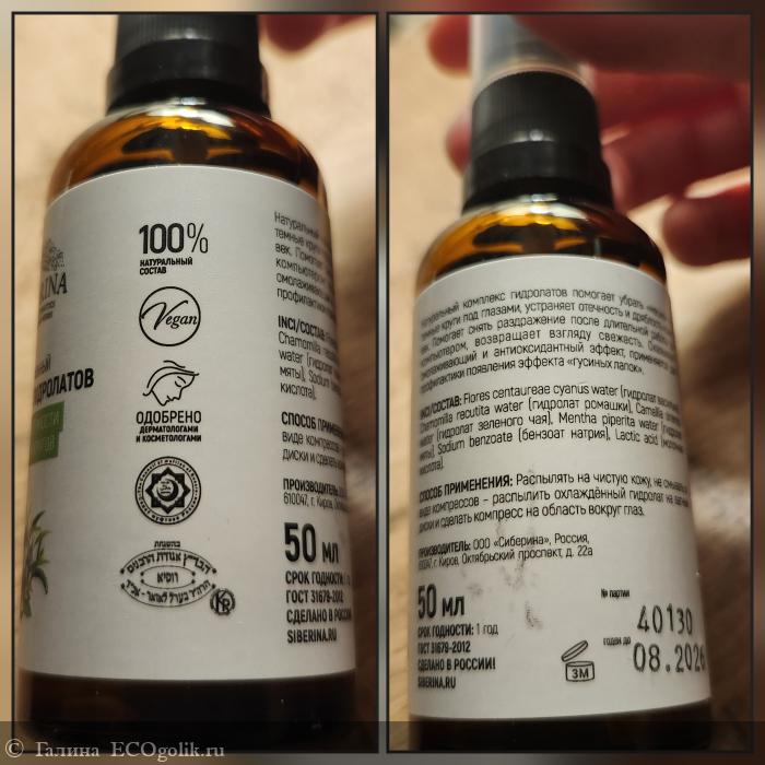 Комплекс гидролатов помогает убрать мешки и тёмные круги под глазами, устраняет отёчность и дряблость кожи век