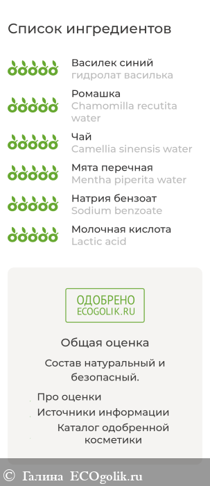 Гидролат василька (Flores centaureae cyanus water), гидролат ромашки (Chamomilla recutita water), гидролат зеленого чая (Camellia sinensis water), гидролат мяты (Mentha piperita water), бензоат натрия (Sodium benzoate), молочная кислота (Lactic аcid).