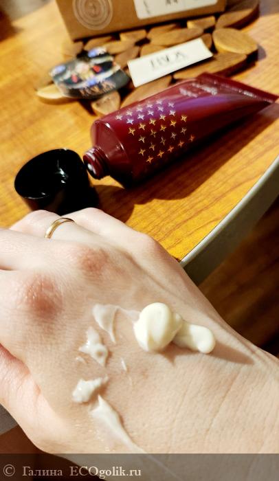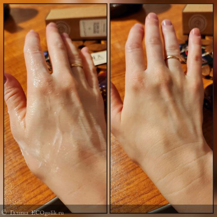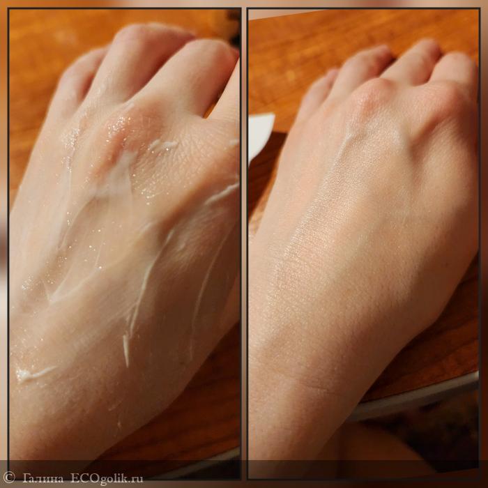Крем быстро впитывается, не оставляет жирности или пленки, при этом кожа сразу мягкая и нежная