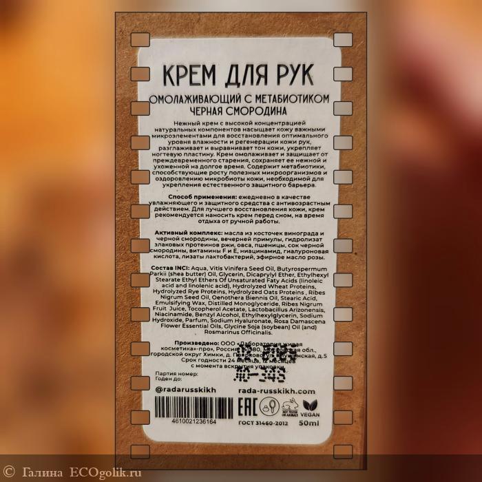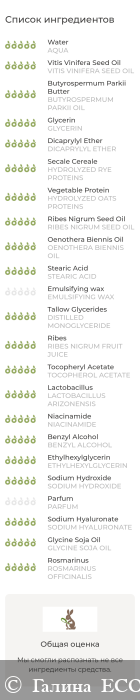 (INCI): AQUA(Вода), VITIS VINIFERA SEED OIL(Масло виноградных косточек), BUTYROSPERMUM PARKII (SHEA BUTTER) OIL(Масло Ши), GLYCERIN(Глицерин), DICAPRYLYL ETHER(Дикаприловый эфир), ETHYLHEXYL STEARATE(Этилгексил стеарат) ETHYL ETHERS OF UNSATURATED FATY ACIDS (LINOLEIC ACID AND LINOLENIC ACID(Линоленовая кислота, Линолевая кислота), HYDROLYZED WHEAT PROTEINS(Гидролизат злаковых протеинов ржи) , HYDROLYZED RYE PROTEINS (гидролизат овса) , HYDROLYZED OATS PROTEINS (Гидролизат пшеницы), RIBES NIGRUM SEED OIL, OENOTHERA BIENNIS OIL, STEARIC ACID, EMULSIFYING WAX, DISTILLED MONOGLYCERIDE (Масло косточек черной смородины), RIBES NIGRUM FRUIT JUICE(Экстракт черной смородины), TOCOPHEROL ACETATE (Витамин Е), LACTOBACILLUS ARIZONENSIS (Лизаты лактобактерий), NIACINAMIDE(Ниацинамид), BENZYL ALCOHOL(бензиловый спирт), ETHYLHEXYLGLYCERIN (Этилгексилглицерин), SODIUM HYDROXIDE(Гидроксид натрия), PARFUM(Натуральная отдушка), SODIUM HYALURONATE(Гиалуроновая кислота), ROSA DAMASCENA FLOWER ESSENTIAL OILS(Эфирное масло розы), GLYCINE SOJA (SOYBEAN) OIL (Соевое масло)(AND) ROSMARINUS OFFICINALIS(Экстракт розмарина)