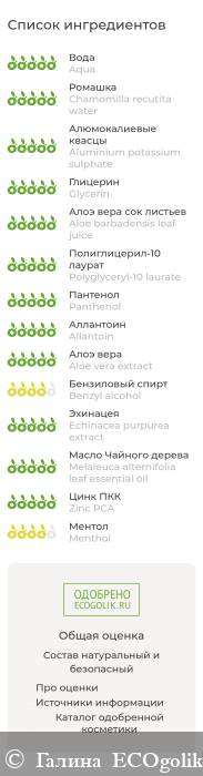 Aqua (вода дистиллированная), Chamomilla recutita water (гидролат ромашки), Aluminium potassium sulphate (алюмокалиевые квасцы), Glycerin (глицерин), Aloe barbadensis leaf juice (гель алоэ вера), Polyglyceryl-10 laurate (полиглицерил-10 лаурат), Panthenol (Д-пантенол), Allantoin (аллантоин), Aloe vera extract (экстракт алоэ вера), Benzyl alcohol (бензиловый спирт), Echinacea purpurea extract (экстракт эхинацеи), Melaleuca alternifolia (tea tree) leaf essential oil (эфирное масло чайного дерева), Zinc PCA (цинк ПКК), Menthol (ментол)