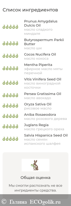 - Комплекс масел в составе (кокоса, миндаля, ши) питают, смягчают и увлажняют кожу