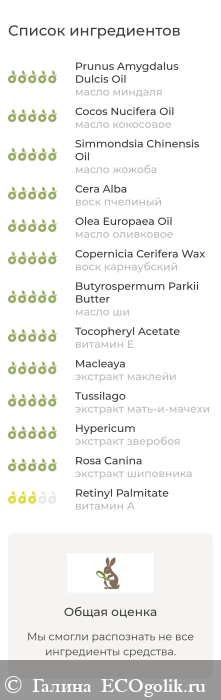 масло миндаля (Prunus amygdalus dulcis (sweet almond) oil), масло кокосовое (Coconut oil), масло жожоба (Simmondsia chinensis (Jojoba) seed oil), воск пчелиный (Beeswax), масло оливковое (Olive oil), воск карнаубский (Carnaubian wax), масло ши (Вutyrospermium parkii (Shea) butter), витамин Е (Tocopherol), экстракт маклейи (Macleya microcarpa extract), экстракт мать-и-мачехи (Tussilago farfara extract), экстракт зверобоя (Hypericum perforatum extract), экстракт шиповника (Rosa cinnamomea extract), витамин А (Retinyl palmitate), пищевой ароматизатор "Миндальное молочко" (Aroma)