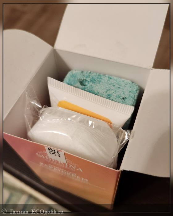 Приезжает в дополнительной внешней упаковке красивого ярко оранжевого цвета, так же как и жидкая пемза)
