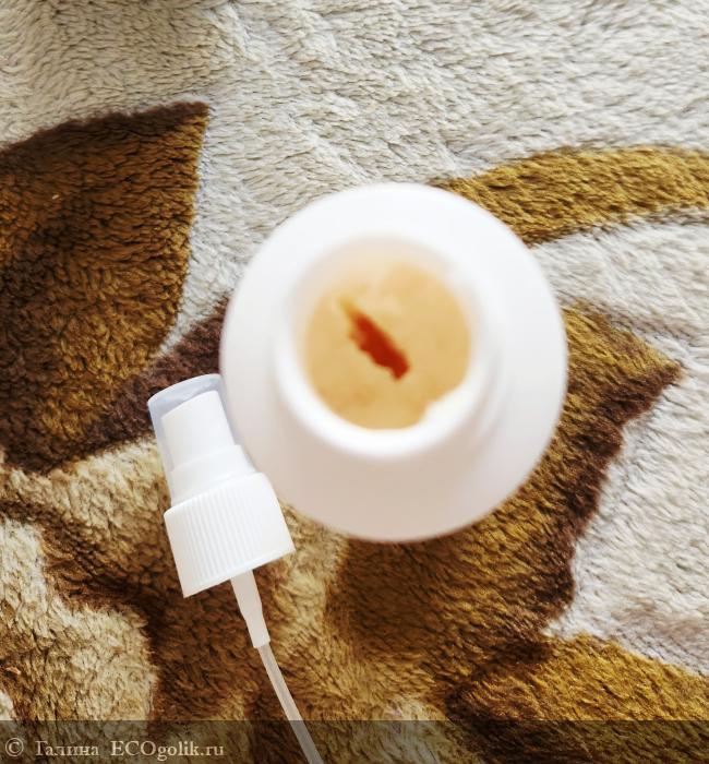 Оснащен дозатором с распылителем, трубка которого достаёт до самого донышка