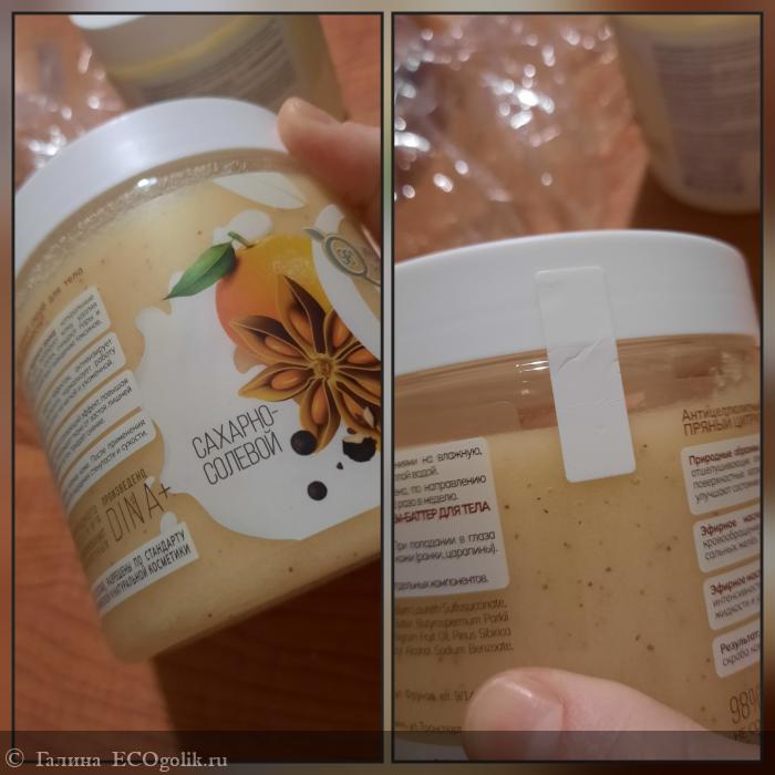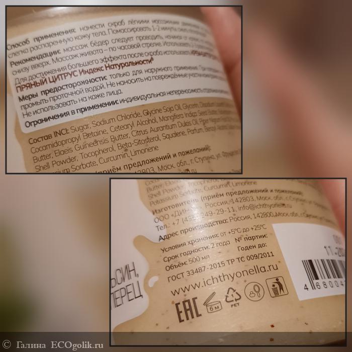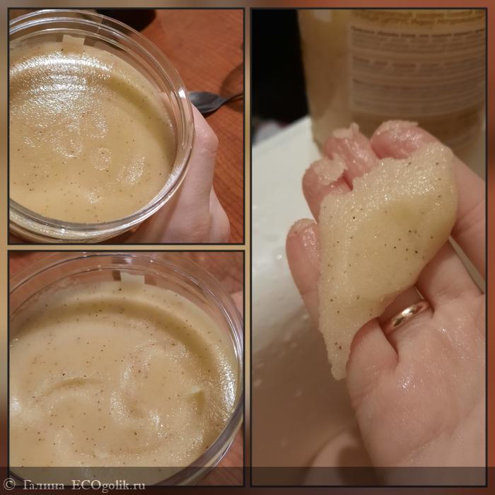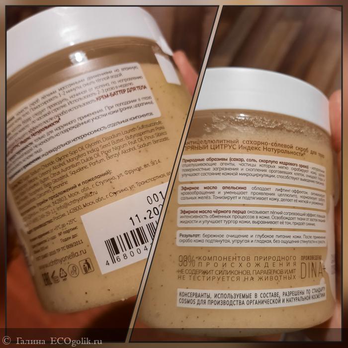 Sugar (Сахар), Sodium Chloride (Соль), Glycine Soja Oil (Масло соевое), Glycerin (Глицерин), Sodium Lauroyl Sarcosinate (Натрия лауроил саркозинат), Cocamidopropyl Betaine (Кокамидопропилбетаин), Cetearyl Alcohol (Цетеариловый спирт), Mangifera Indica Seed Butter (Масло манго баттер), Butyrospermum Parkii Butter (Масло ши баттер), Elaeis Guineensis Butter (Пальмовое масло-баттер), Citrus Aurantium Dulcis Oil (Эфирное масло сладкого апельсина), Piper Nigrum Fruit Oil (Эфирное масло чёрного перца), Pinus Sibirica Shell Powder (Скорлупа кедрового ореха), Tocopherol, (Токоферол / витамин Е), Beta-Sitosterol (Бета-ситостерол), Squalene (Сквален), Parfum (Отдушка), Benzyl Alcohol, Sodium Benzoate, Potassium Sorbate (Бензиловый спирт, натрия бензоат, калия сорбат / консерванты, разрешённые по стандарту COSMOS для производства органической косметики), Curcumin (Куркумин / натуральный краситель), Limonene (Лимонен / компонент эфирных масел)