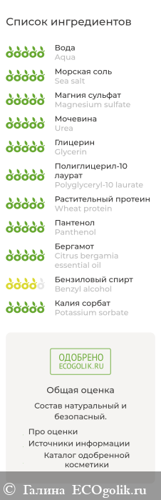 Aqua (вода дистиллированная), Sea salt (соль морская), Magnesium sulfate (сульфат магния), Urea (мочевина), Glycerin (глицерин), Polyglyceryl-10 laurate (полиглицерил-10 лаурат), Wheat protein (пшеничный протеин), Panthenol (Д-пантенол), Citrus bergamia essential oil (эфирное масло бергамота), Benzyl аlcohol (бензиловый спирт), Potassium sorbate (сорбат калия)