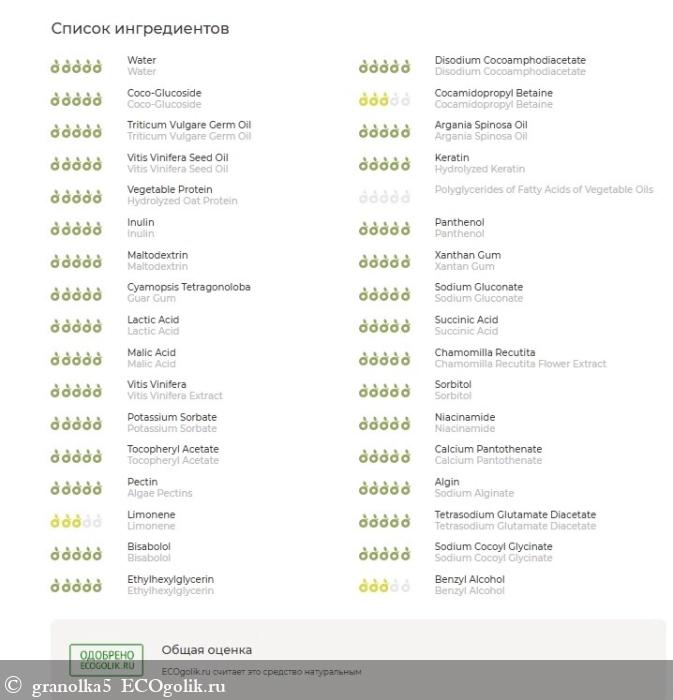 Water, Disodium Cocoamphodiacetate, Coco-Glucoside, Cocamidopropyl Betaine, Triticum Vulgare (Wheat) Germ Oil, Argania Spinosa (Argan) Oil, Vitis Vinifera (Grape) Seed Oil, Hydrolyzed Keratin, Hydrolyzed Wheat Protein, Hydrolyzed Oat Protein, Polyglycerides of Fatty Acids of Vegetable Oils, Inulin, Panthenol, Maltodextrin, Xantan Gum, Guar Gum, Sodium Gluconate, Lactic Acid, Succinic Acid, Malic Acid, Chamomilla Recutita (Matricaria) Flower Extract, Vitis Vinifera Extract, Sorbitol Potassium Sorbate, Niacinamide (Vitamin PP), Tocopheryl Acetate (Vitamin E), Calcium Pantothenate (Vitamin B5), Algae Pectins, Sodium Alginate, Limonene, Tetrasodium Glutamate Diacetate, Bisabolol, Sodium Cocoyl Glycinate, Ethylhexylglycerin, Benzyl Alcohol Alcohol.