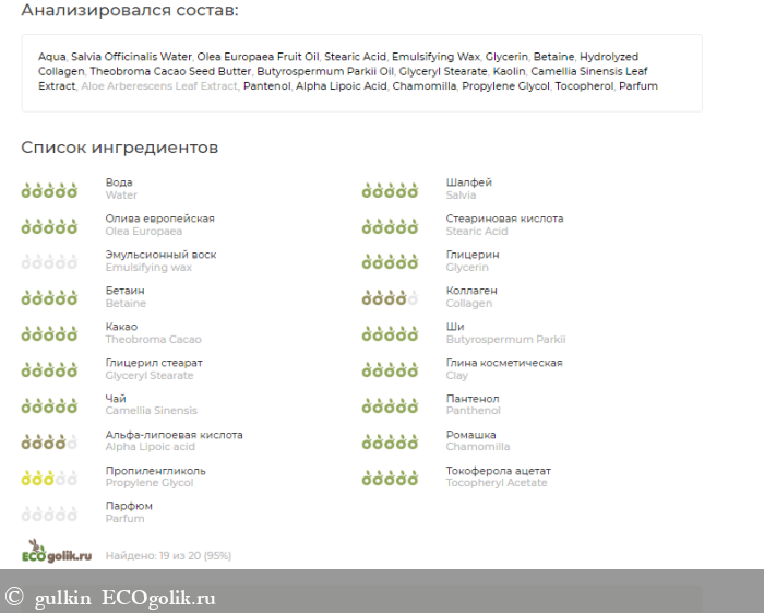 Aqua, Salvia Officinalis Water, Olea Europaea (olive) Fruit Oil, Stearic Acid, Emulsifying Wax, Glycerin, Betaine, Hydrolyzed Collagen, Theobroma Cacao Seed Butter, Butyrospermum Parkii (Shea) Oil, Glyceryl Stearate, Kaolin, Camellia Sinensis Leaf Extract, Aloe Arberescens Leaf Extract, Pantenol, Alpha Lipoic Acid (ALA), Chamomilla, Propylene Glycol, Tocopherol, Parfum