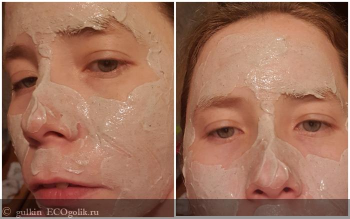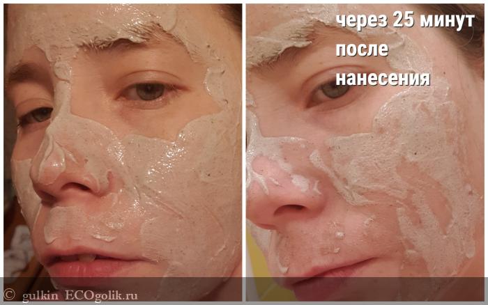 Спустя 25 минут видно, часть маски впиталась, но к удивлению кожу во время beuty-процедуры не стягивает