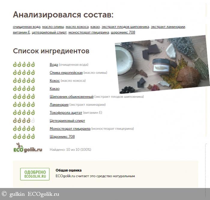 В составе: очищенная вода, масло оливы, масло кокоса, какао, масляный экстракт плодов шиповника, масляный экстракт ламинарии, витамин Е, цетеариловый спирт, эмульсионный воск, биоконсервант шаромикс 708.