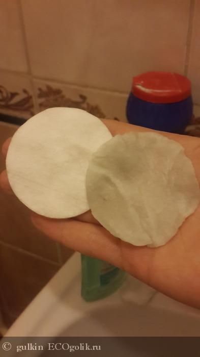 - Смываю маску водой, но дабы вымыть всю маску с лица прохожусь ватным диском, смоченный тоником. Для наглядности привела фото, где чистый ватный диск и ватный диск, которым я очистила лицо после того как маску уже смыла.