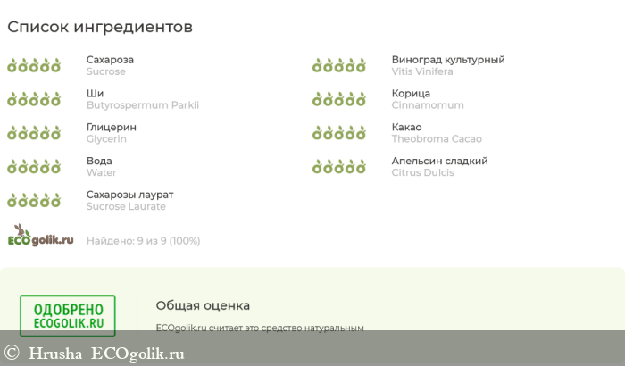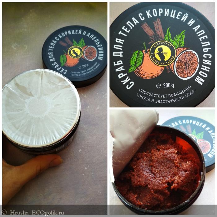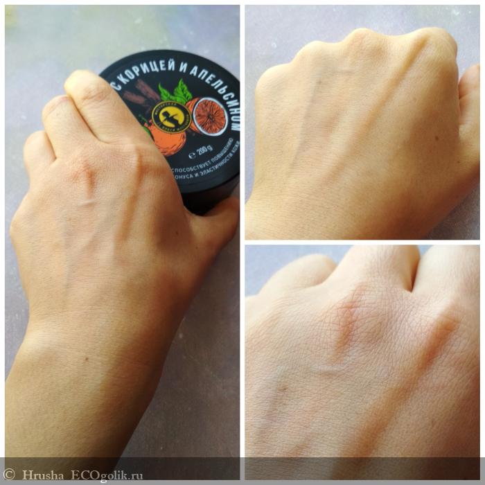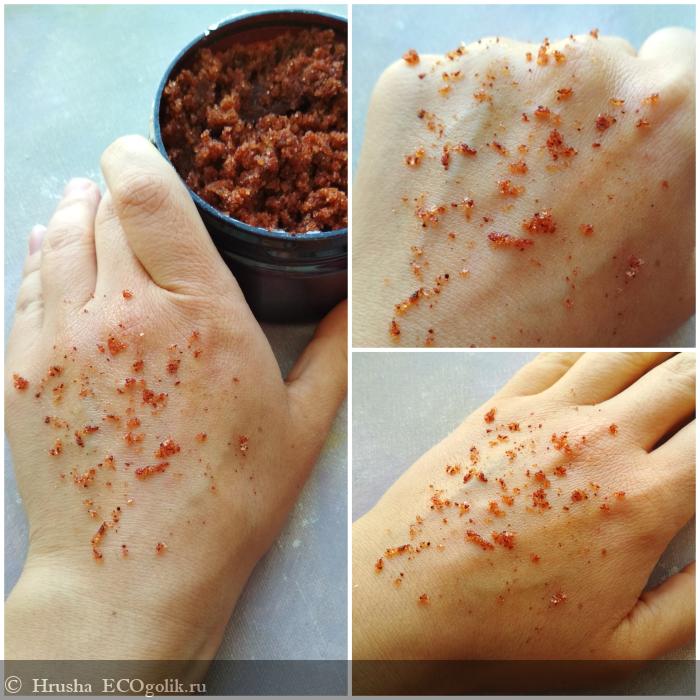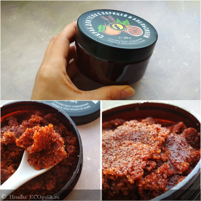 Кроме скрабирующих частиц сахара и корицы, мы видим тут масла виноградной косточки, ши и какао, эфирное масло апельсина и легкий эмульгатор