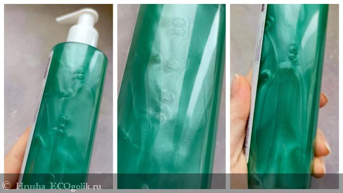Через прозрачность пластика флакона видим цвет шампуня - он изумрудный с перламутровыми переливами.