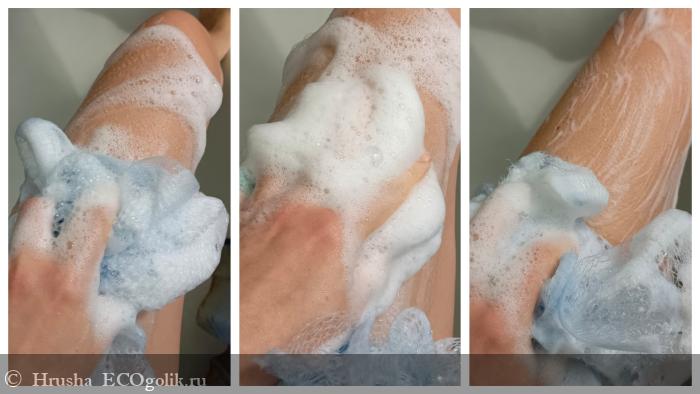 Пенка на такой мочалке оптимальная для этого состава - не крупная, кремовая.