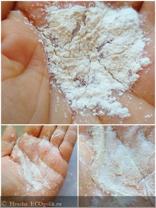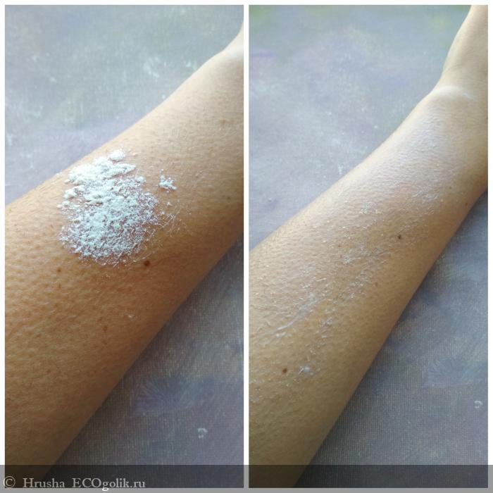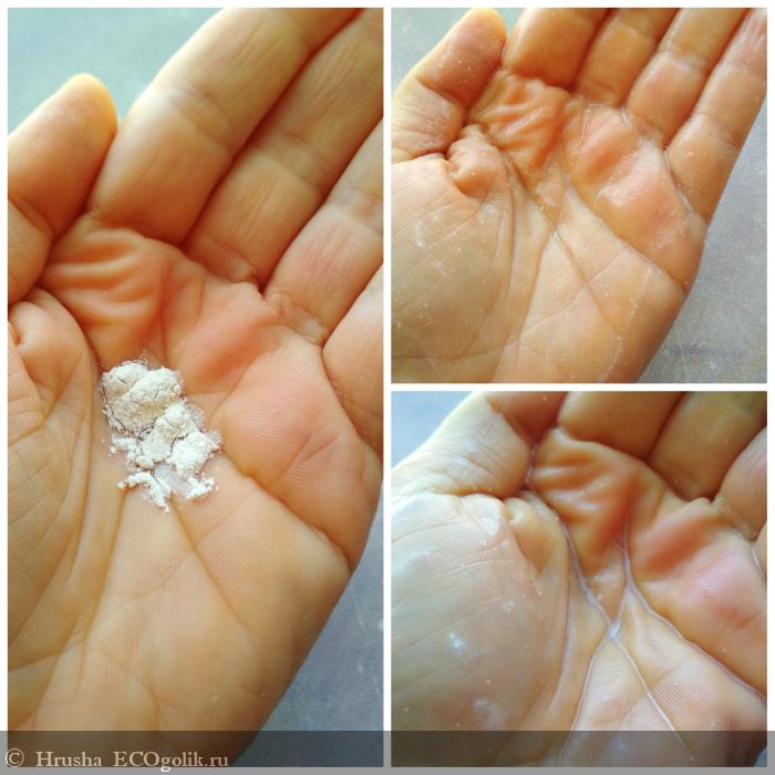 Если не наносить на влажную кожу или не растирать предварительно в ладонях, а добавить воды в саму пудру - получим кашицу.