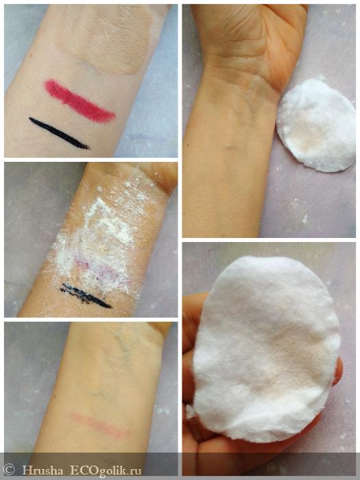 Результат меня удивил - остался небольшой след от помады и чуть въелся тон. Протерла ватным диском с мицелляркой - он не так уж и много по итогу запачкан. Я не планирую снимать с пудрой макияж, но факт подтверждаю - действительно очищает даже от стойкого макияжа, а уж минеральный уберет вообще легко