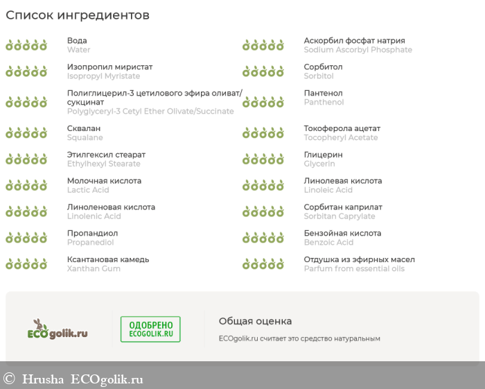 - разрешенный европейскими системами экосертификации для натуральной косметики консервант - Sorbitan Caprylate, Propanediol, Benzoic Acid