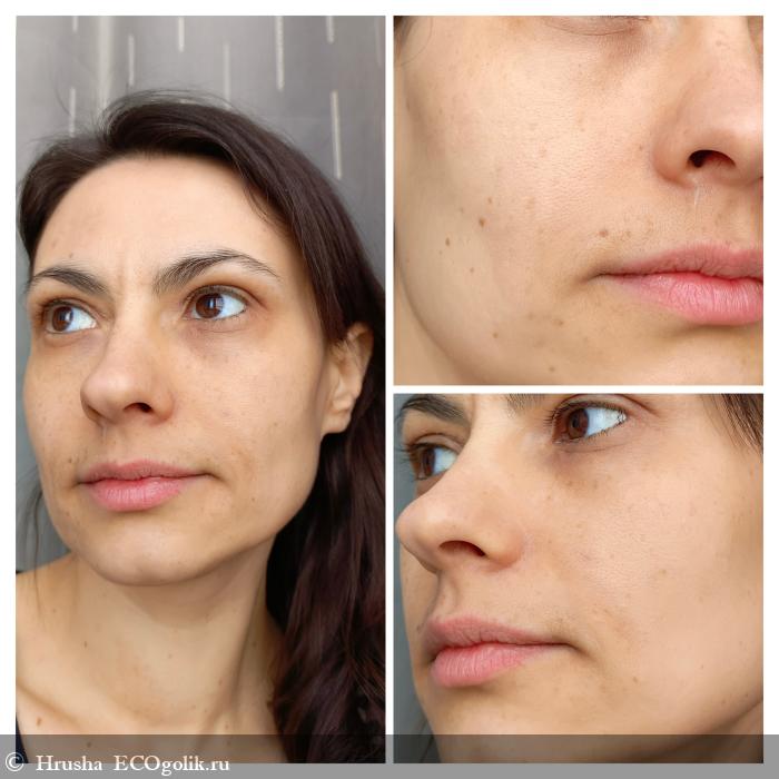 Как и заявлено, после Флюида отлично ложится декоративная косметика - минеральная пудра, например. Можно наносить макияж сразу, время на ожидание впитывания не требуется. А после длительного применения кожа и правда выглядит и очучается ровнее, глаже, без шелушений - можно и без тона разгуливать