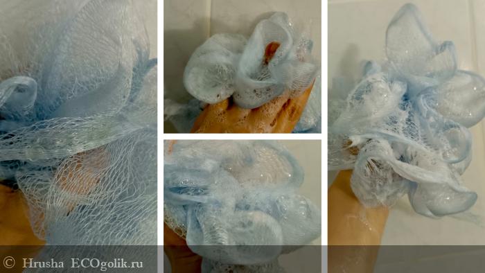 У меня "цветочек", на котором всегда много пены, но и на "бабушкиной" вязаной мочалке, которыми пользуются мои мужчины, а также на люфе пены будет достаточно, хоть и заметно меньше.