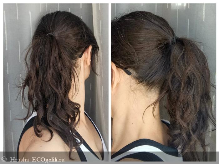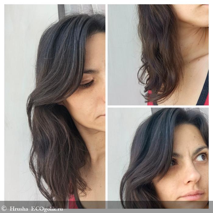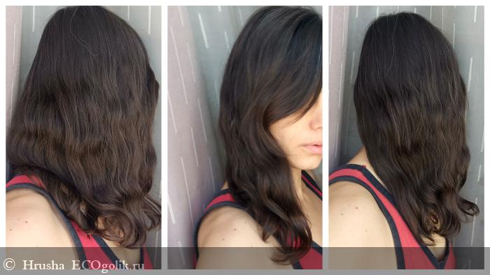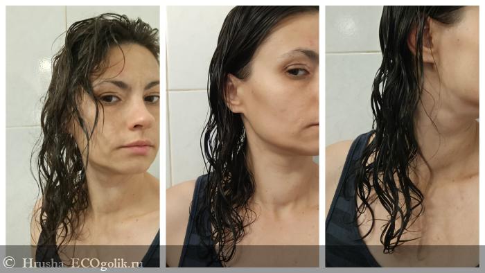 Но волна остается. Объем также не "съедается" - кондей не распространяется по волосам до корней, не придает жирности, не сокращает время между моим стандартным мытьем - в общем, не влияет на макушку, на которую он не наносился.