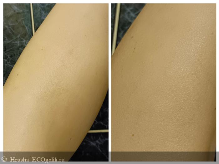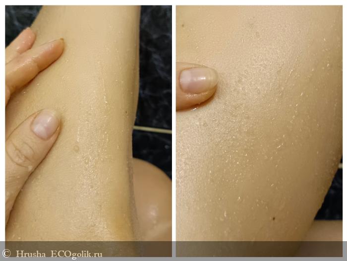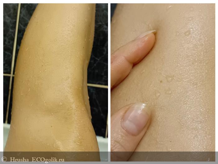 Видим опять капельки воды, остающиеся на оставшейся умасленной коже - но эта плёнка лично по моим ощущения не чрезмерная, она потом не остается на полотенце или одежде.