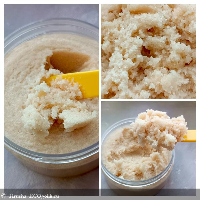 Текстура его оптимальная - он и не сыпучий, хоть его можно распотрошить лопаточкой, но и не сухой дубовый - не растягивает кожу, пока наносишь. Слово крем-скраб ему достаточно хорошо подходит - очень комфортный в применении. Возможно, мёд и соевый воск в составе также сделали консистенцию такой приятной.