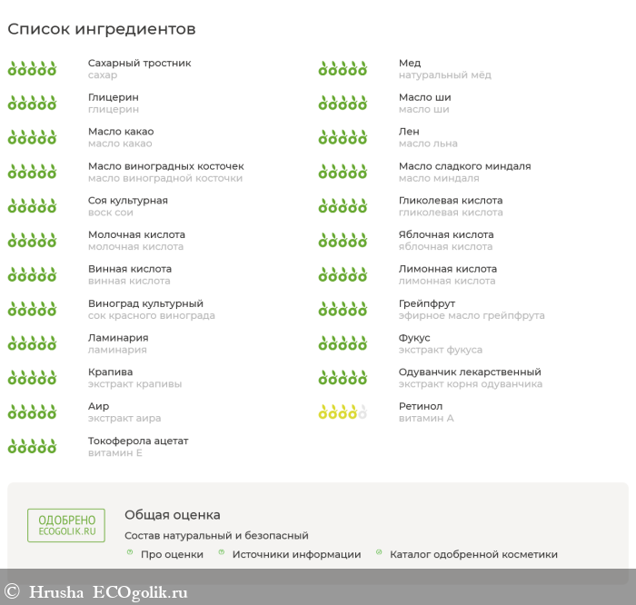 Присутствие мёда не подойдет веганам и аллергикам, а в целом состав для скраба очень богат.