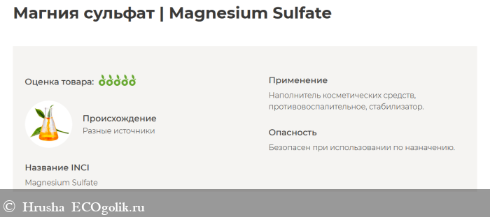 В этом экземпляре мне понравился чистый типичный состав - Сульфат магния 99,9%, а также описание источника его получения