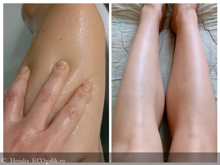 На фото далее кожа сразу после скраба еще под душем - не знаю, понятно ли - я хотела передать, что при нажатии кожа такая упруго-маслянистая (но не жирнючая), а справа на утро - вполне себе поблескивает здоровым увлажнением