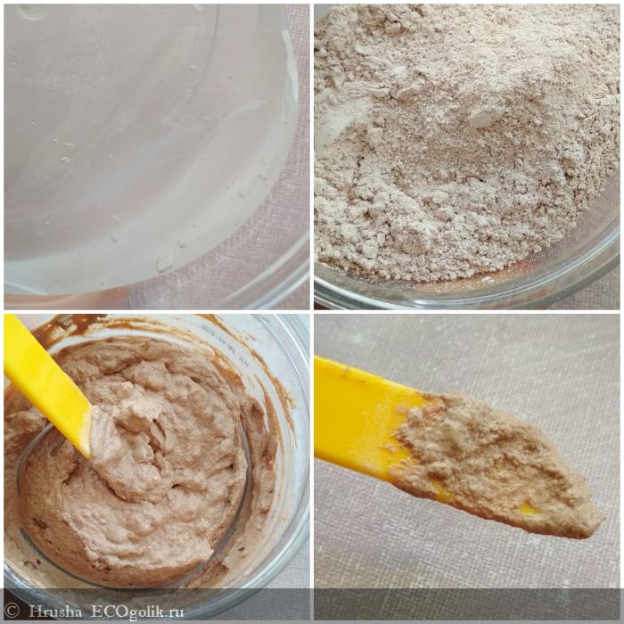 Аромат жидкой гелевой части косметический, легкий, приятный, как у большинства масок бренда. Порошковая часть пахнет слегка глиной и какао. После смешивания общий аромат маски мне тоже напоминает какао с оттенками медицины, глины и травок.