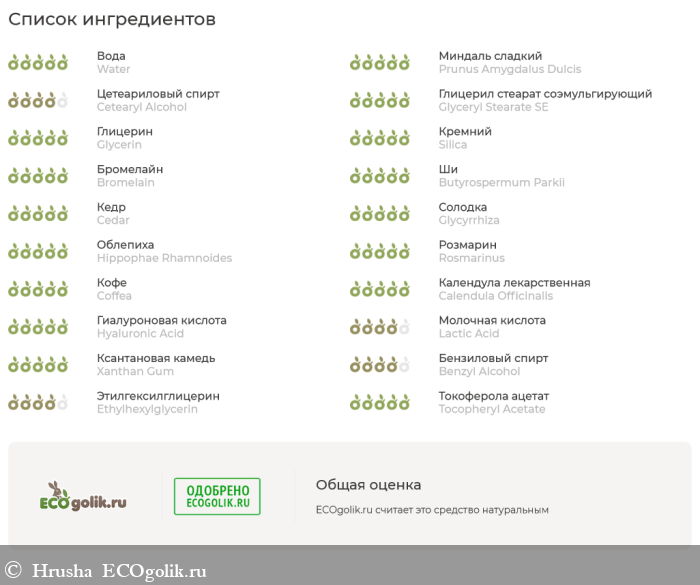 - экстракт зеленого кофе: антиоксидант, замедляет старение и устраняет отечность