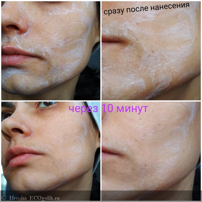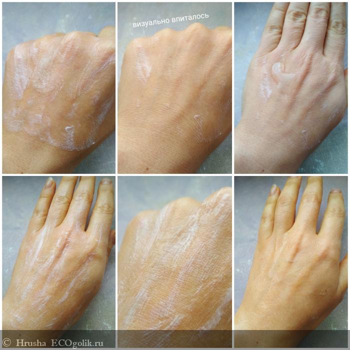 Распределение мягкое кремовое. Через 10 отведенных минут маска визуально частично впиталась. На коже это не ощущается - стягивания не происходит.